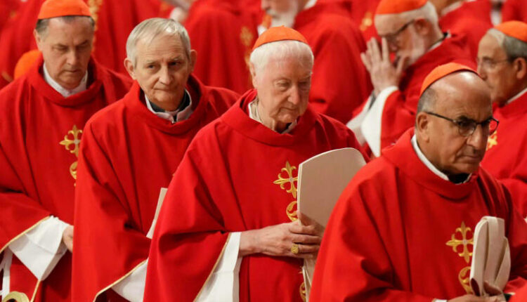 A partir da esquerda) Os cardeais Ángel Fernández Artime, Matteo Maria Zuppi, Timothy Peter Joseph Radcliffe e Fernando Natalio Chomali Garib assistem a missa em 28 de abril© Dimitar DILKOFF