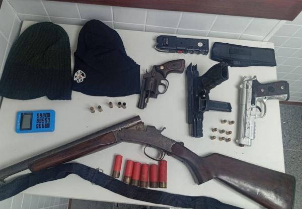 Com o grupo foram foi apreendida uma espingarda calibre 12, uma pistola calibre 380, um revólver calibre 38, carregador de pistola, munições, uma máquina de choque, uma faca, um simulacro de arma de fogo, mascaras e uma máquina de cartão. Um quarto suspeito fugiu por uma área de mata.
